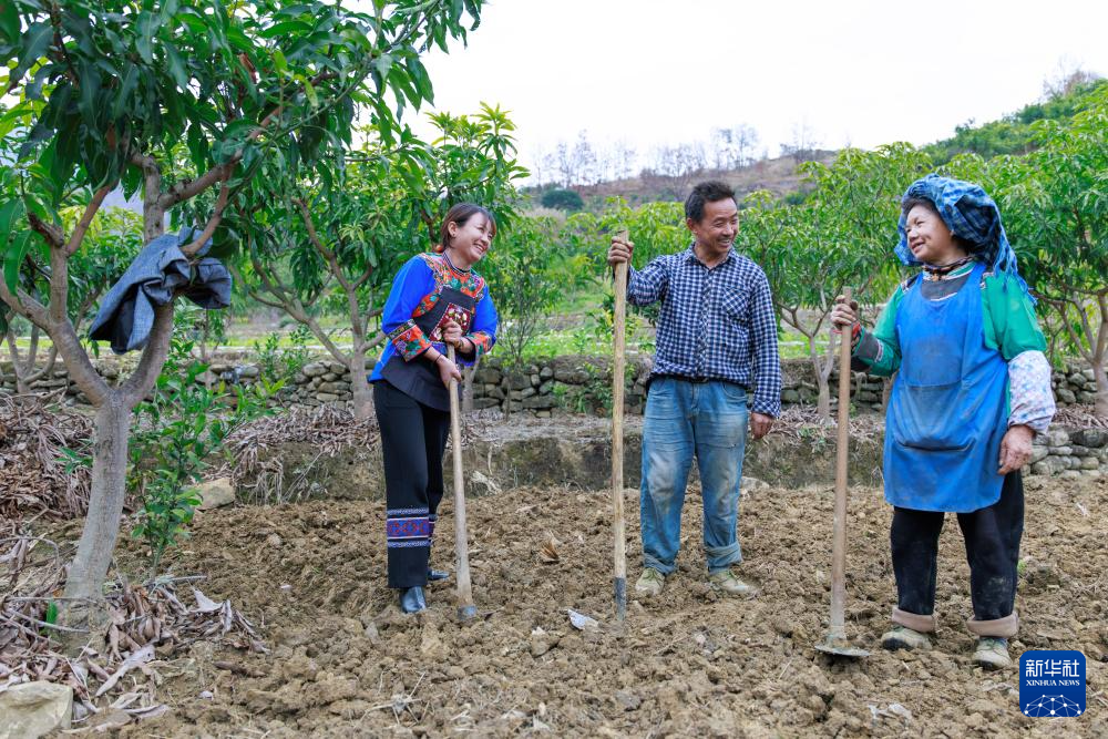 盧丹(左)在鎮寧布依族苗族自治縣六馬鎮致富村與村民交流果樹種植情況(2025年2月20日攝)。