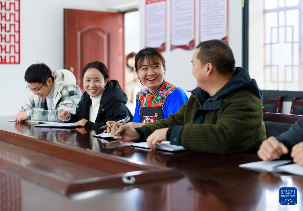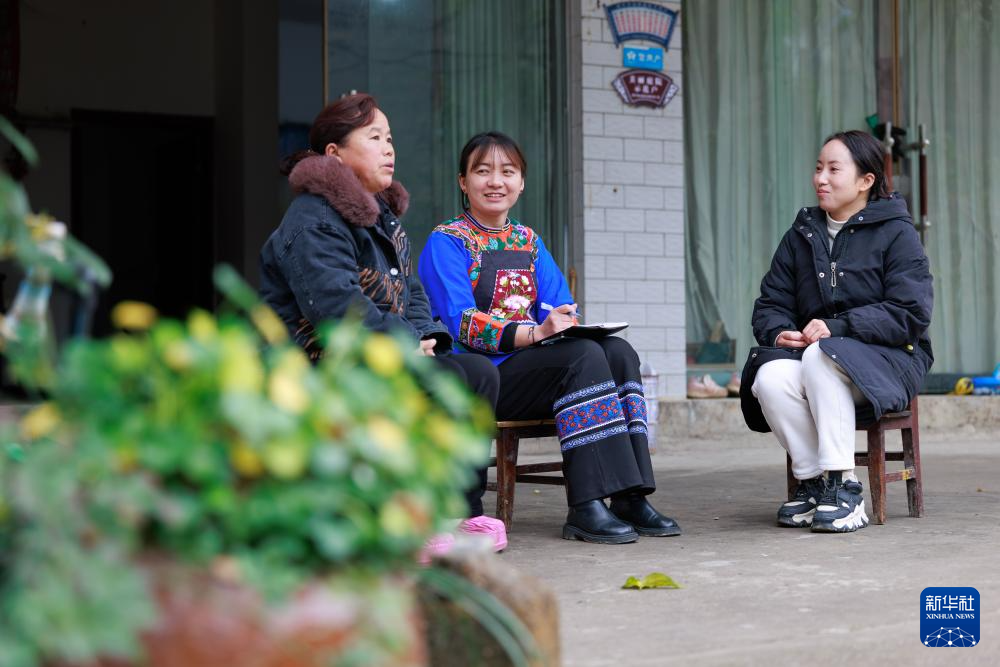 盧丹(右二)在鎮寧布依族苗族自治縣六馬鎮致富村村委會和同事交流工作(2025年2月20日攝)。