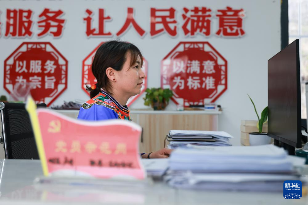 盧丹在鎮寧布依族苗族自治縣六馬鎮致富村村委會內工作(2025年2月20日攝)。