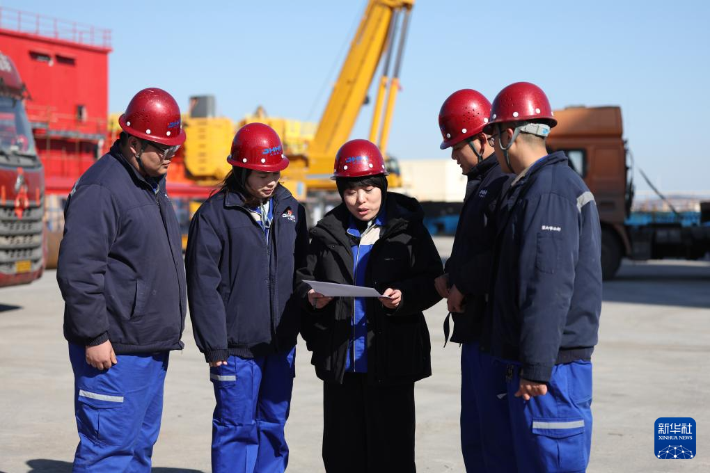 在大連華銳重工集團股份有限公司港口機械制造事業部,孫元華(中)和同事在工程安裝現場交流工作(2025年2月20日攝)。