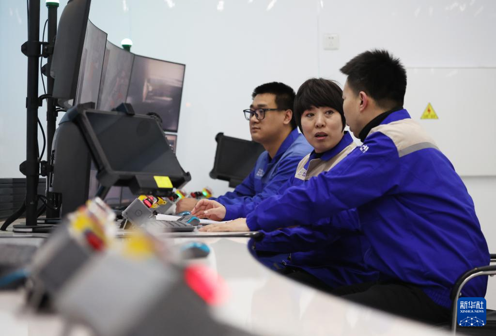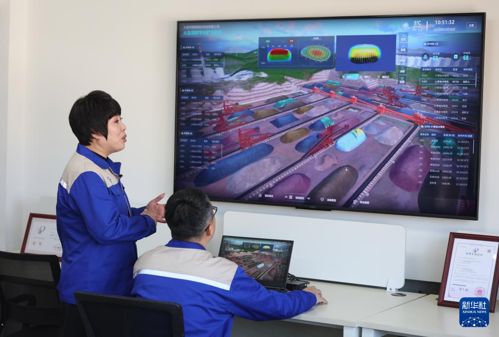 在大連華銳重工集團股份有限公司智能化實驗室,孫元華(左)和同事操作大連港數字化礦石碼頭系統(2025年2月20日攝)。