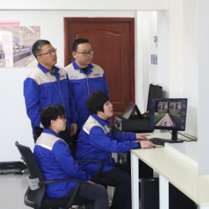 在大連華銳重工集團股份有限公司智能化實驗室,孫元華(右下)和同事操作焦爐機械智能決策分析系統(2025年2月20日攝)。