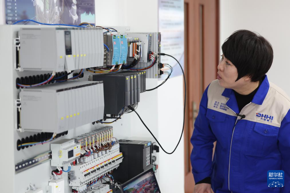 在大連華銳重工集團股份有限公司智能化實驗室,孫元華查看國產自動化控制系統應用設備(2025年2月20日攝)。