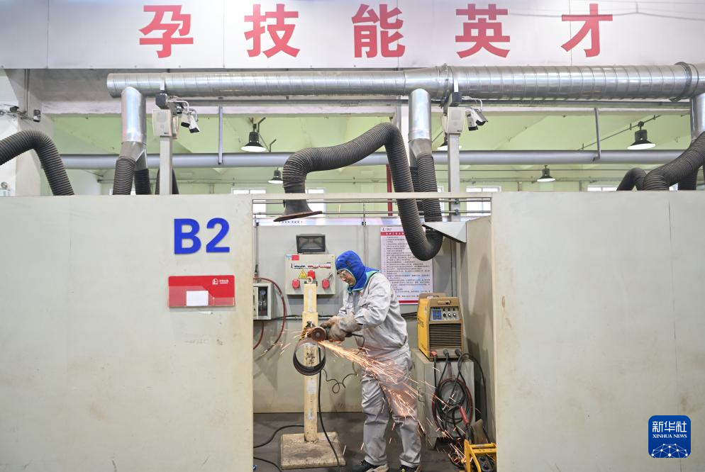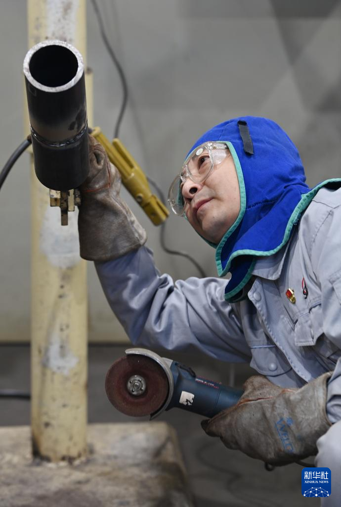 在中石化第四建設有限公司工匠學院,張振連打磨焊口(2025年1月10日攝)。