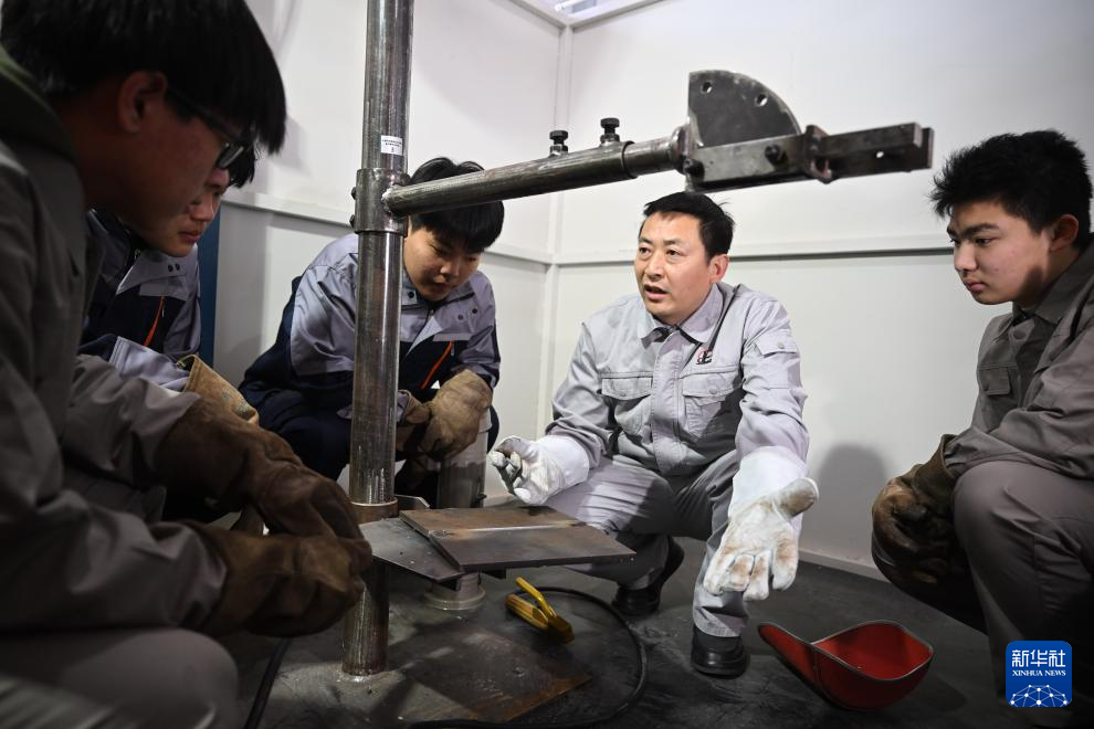 在天津市漢沽中專,張振連(右二)為學生們培訓焊接專業技能(2025年2月24日攝)。