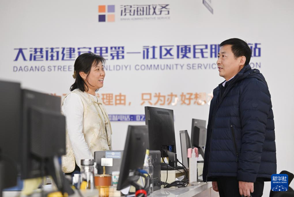 在天津市濱海新區大港街道建安里第一社區便民服務站,張振連(右)和工作人員交流(2025年2月21日攝)。