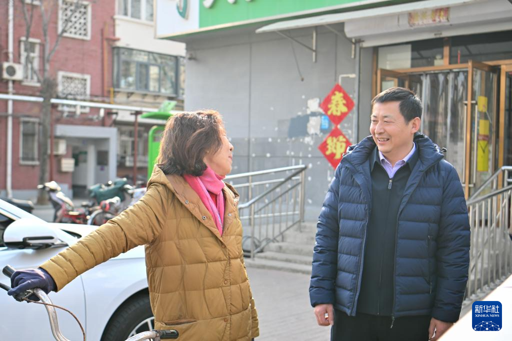 在天津市濱海新區大港街道建安里第一社區,張振連(中)聽取居民建議(2025年2月21日攝)。