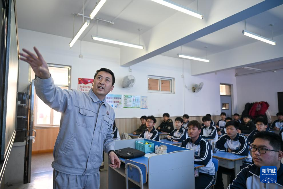 在天津市漢沽中專,張振連(左)為學生們講解“張振連創新工作室”培養訓練模式(2025年2月24日攝)。