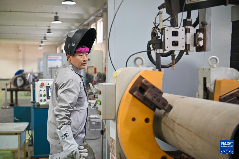 在中石化第四建設有限公司工匠學院,張振連查看焊口(2025年1月10日攝)。