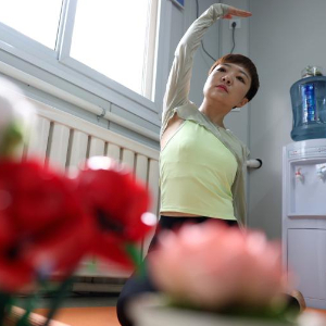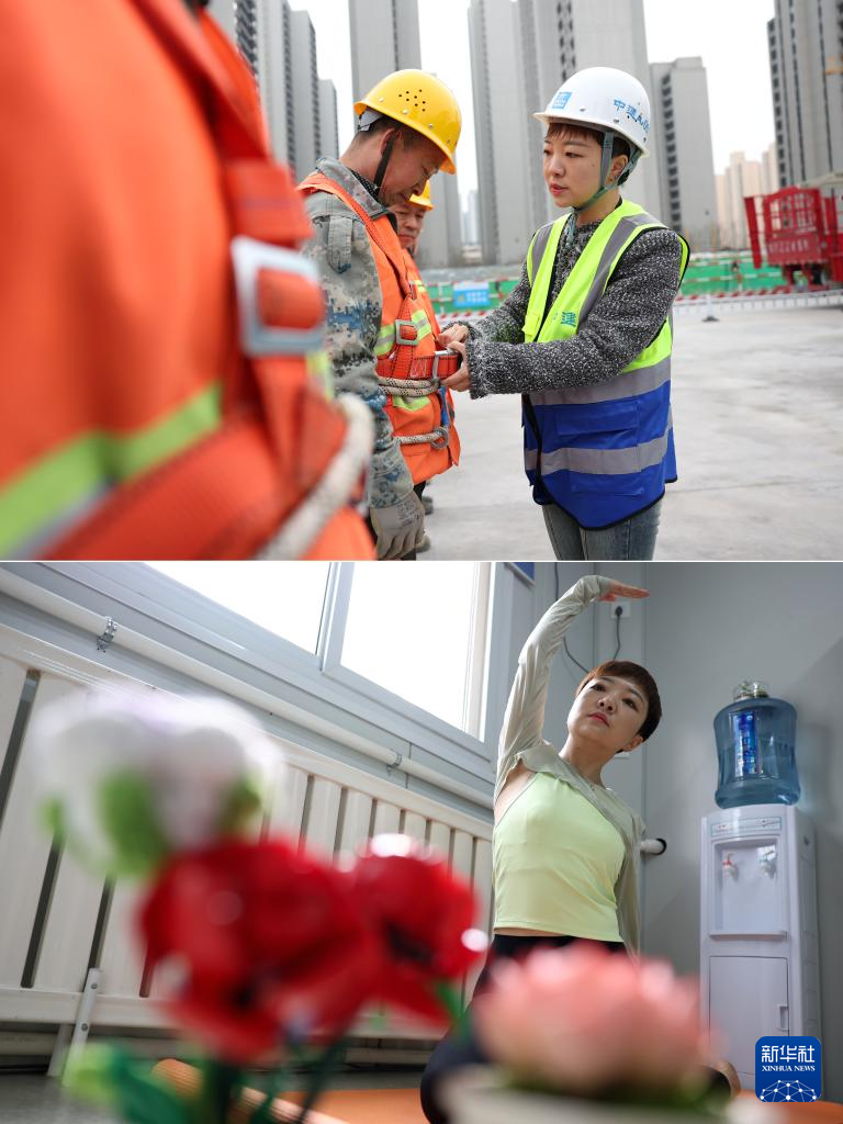 拼版照片:上圖為36歲的中建三局蘭州分公司一處項目的政工負責人沈忱(右)在施工現場為工人開展安全教育并檢查安全帶佩戴情況(3月6日攝);下圖為愛好瑜伽的沈忱在項目工地的活動室里練習瑜伽(3月6日攝)。