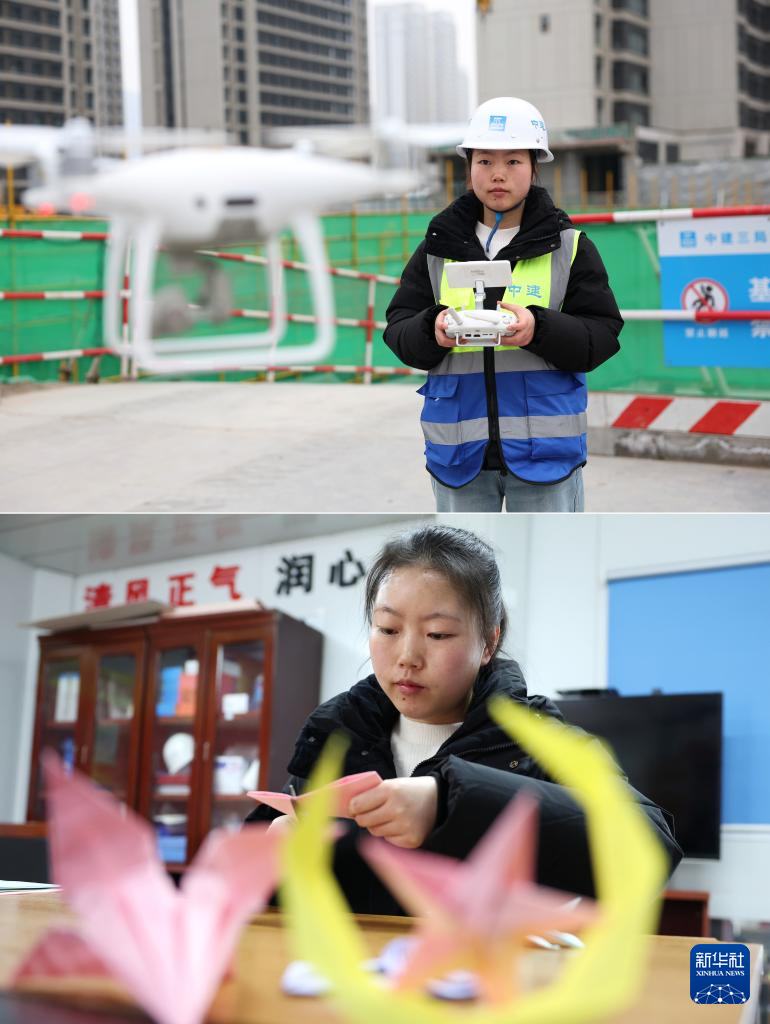 拼版照片:上圖為26歲的中建三局蘭州分公司一處項目的技術員趙文在施工現場進行項目航拍作業(3月6日攝);下圖為愛好手作的趙文在項目工地的活動室里制作折紙作品(3月6日攝)。