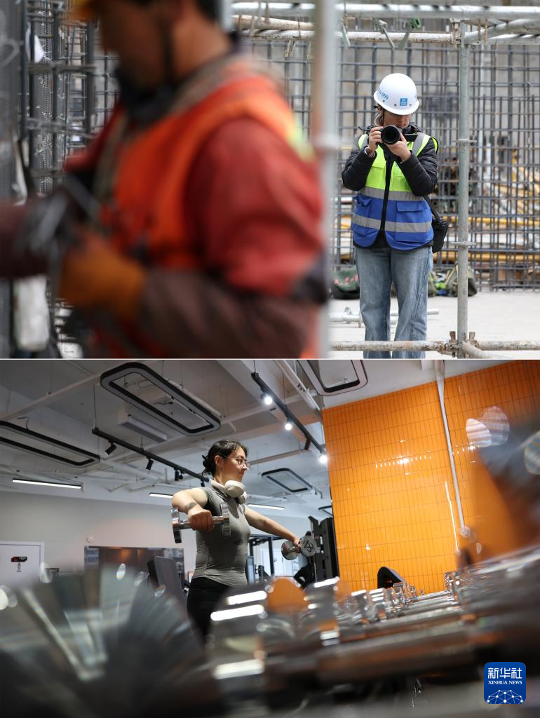 拼版照片:上圖為38歲的中建三局蘭州分公司一處項目的黨支部副書記徐紅莉在施工現場拍攝正在作業的工友,為黨建活動做準備(3月6日攝);下圖為愛好健身的徐紅莉在健身房里鍛煉(3月6日攝)。
