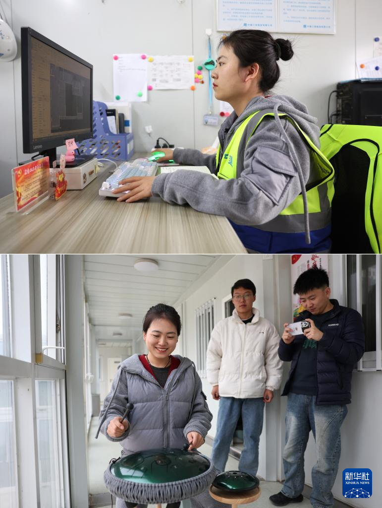 拼版照片:上圖為28歲的中建三局蘭州分公司一處項目的商務負責人李娜娜在辦公室使用軟件進行工程算量(3月6日攝);下圖為愛好音樂的李娜娜(左一)在項目部為同事表演空靈鼓彈奏(3月6日攝)。