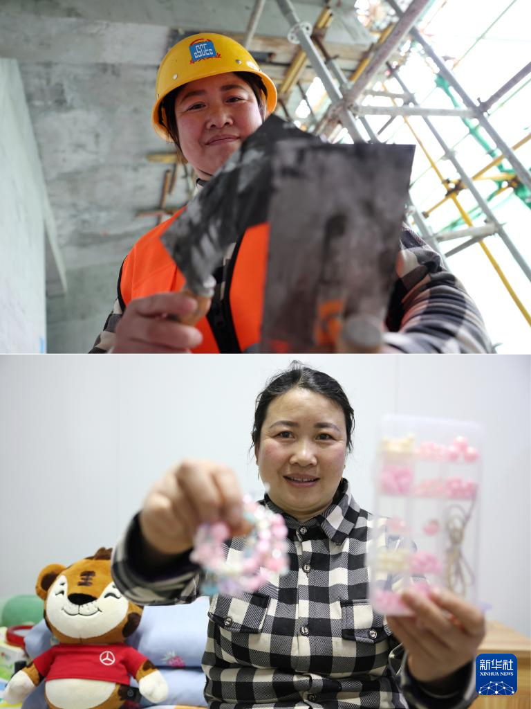 拼版照片:上圖為46歲的中建三局蘭州分公司一處項目的砼工汪元琴在施工現場抹灰,準備修復混凝土表觀缺陷(3月6日攝);下圖為愛好手工制作的汪元琴在項目工地的宿舍里展示自己制作的手串飾品(3月6日攝)。