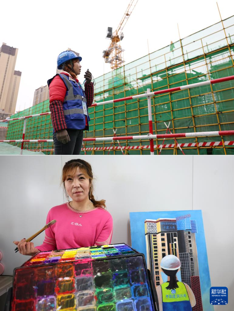 拼版照片:上圖為40歲的中建三局蘭州分公司一處項目的塔吊信號工趙巧珍在塔吊作業區進行吊裝材料指揮調度作業(3月6日攝);下圖為愛好美術的趙巧珍在項目工地的活動室展示自己的繪畫作品(3月6日攝)。