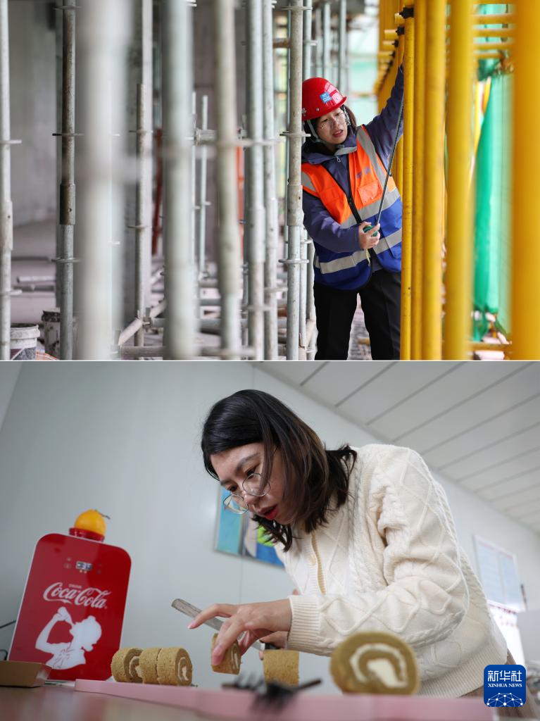 拼版照片:上圖為34歲的中建三局蘭州分公司一處項目的安全員李河珍在施工現場驗收落地式腳手架安裝情況(3月6日攝);下圖為愛好烘焙的李河珍將自己制作的蛋糕切塊準備分給工友品嘗(3月6日攝)。