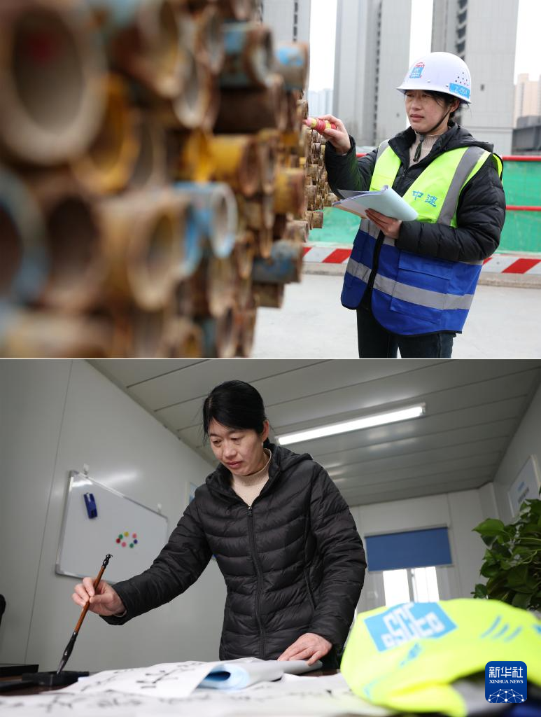 拼版照片:上圖為34歲的中建三局蘭州分公司一處項目的材料員劉桂花在施工現場對進場物資進行盤點(3月6日攝);下圖為愛好書法的劉桂花在項目工地的活動室里練字(3月6日攝)。