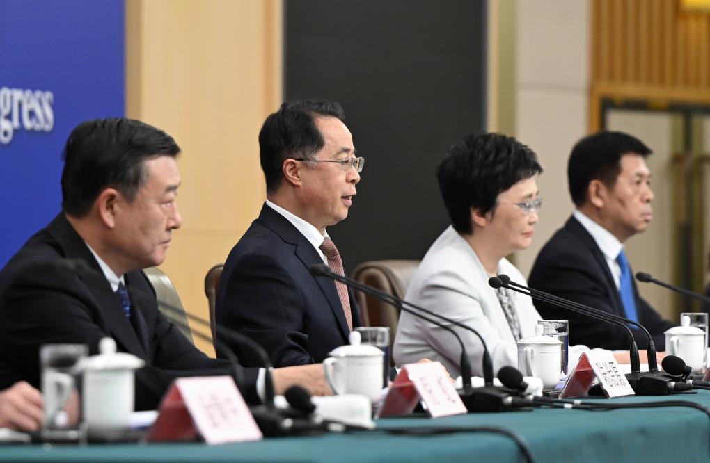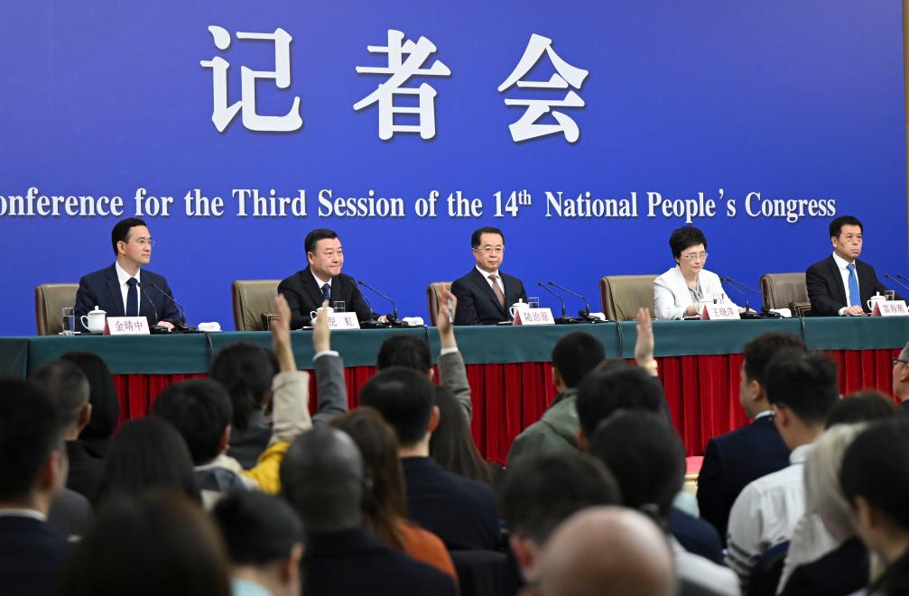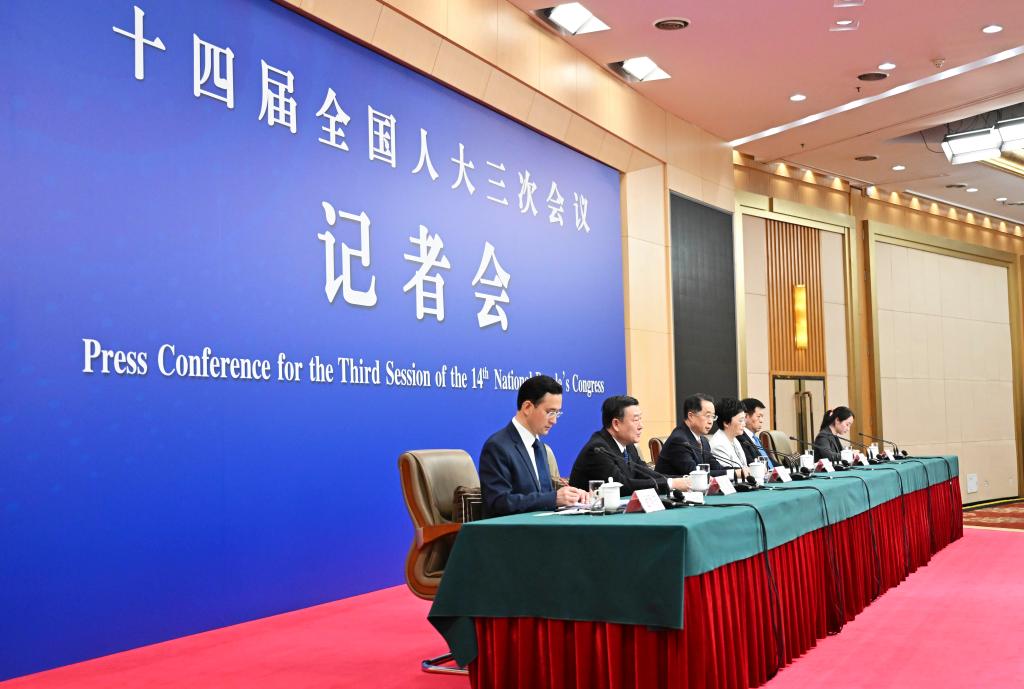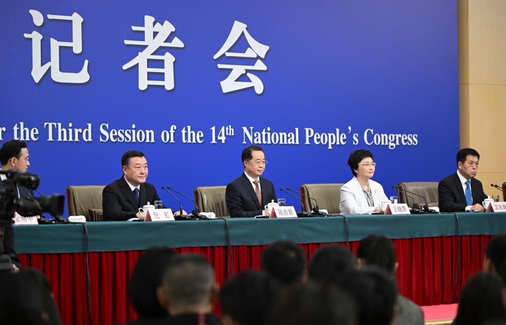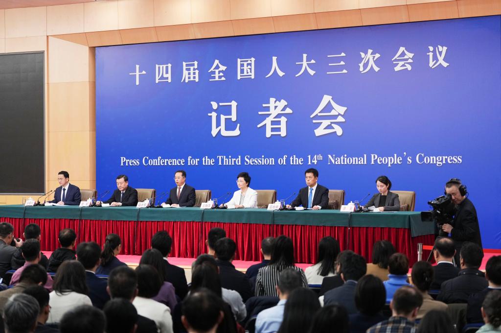3月9日,十四屆全國人大三次會議在北京梅地亞中心新聞發布廳舉行記者會。民政部部長陸治原、人力資源和社會保障部部長王曉萍、住房和城鄉建設部部長倪虹、國家衛生健康委員會主任雷海潮就民政、就業和社會保障、住房、衛生健康等相關問題回答中外記者提問。