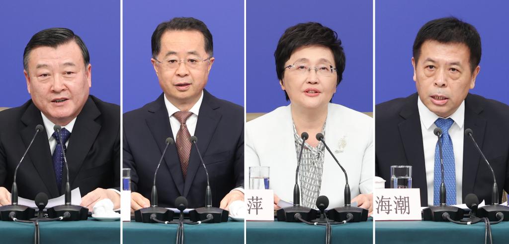 3月9日,十四屆全國人大三次會議在北京梅地亞中心新聞發布廳舉行記者會。民政部部長陸治原(左二)、人力資源和社會保障部部長王曉萍(右二)、住房和城鄉建設部部長倪虹(左一)、國家衛生健康委員會主任雷海潮(右一)就民政、就業和社會保障、住房、衛生健康等相關問題回答中外記者提問(拼版照片)。