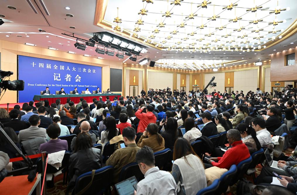 3月9日,十四屆全國人大三次會議在北京梅地亞中心新聞發布廳舉行記者會。民政部部長陸治原、人力資源和社會保障部部長王曉萍、住房和城鄉建設部部長倪虹、國家衛生健康委員會主任雷海潮就民政、就業和社會保障、住房、衛生健康等相關問題回答中外記者提問。這是新華社記者在提問。