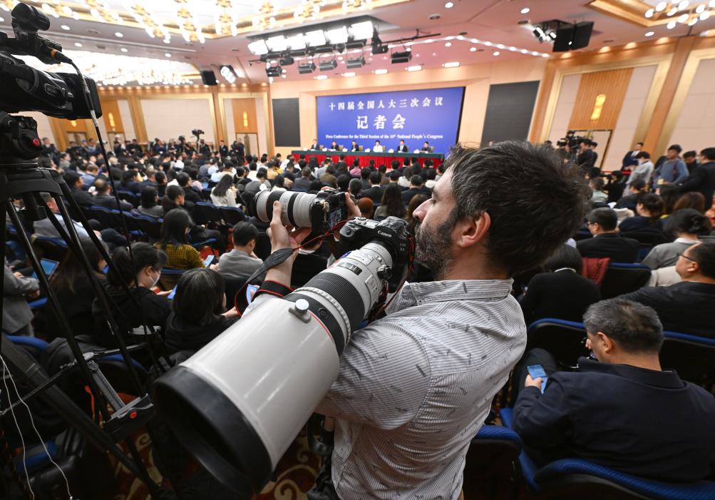3月9日,十四屆全國人大三次會議在北京梅地亞中心新聞發布廳舉行記者會。民政部部長陸治原、人力資源和社會保障部部長王曉萍、住房和城鄉建設部部長倪虹、國家衛生健康委員會主任雷海潮就民政、就業和社會保障、住房、衛生健康等相關問題回答中外記者提問。這是記者在現場采訪拍攝。