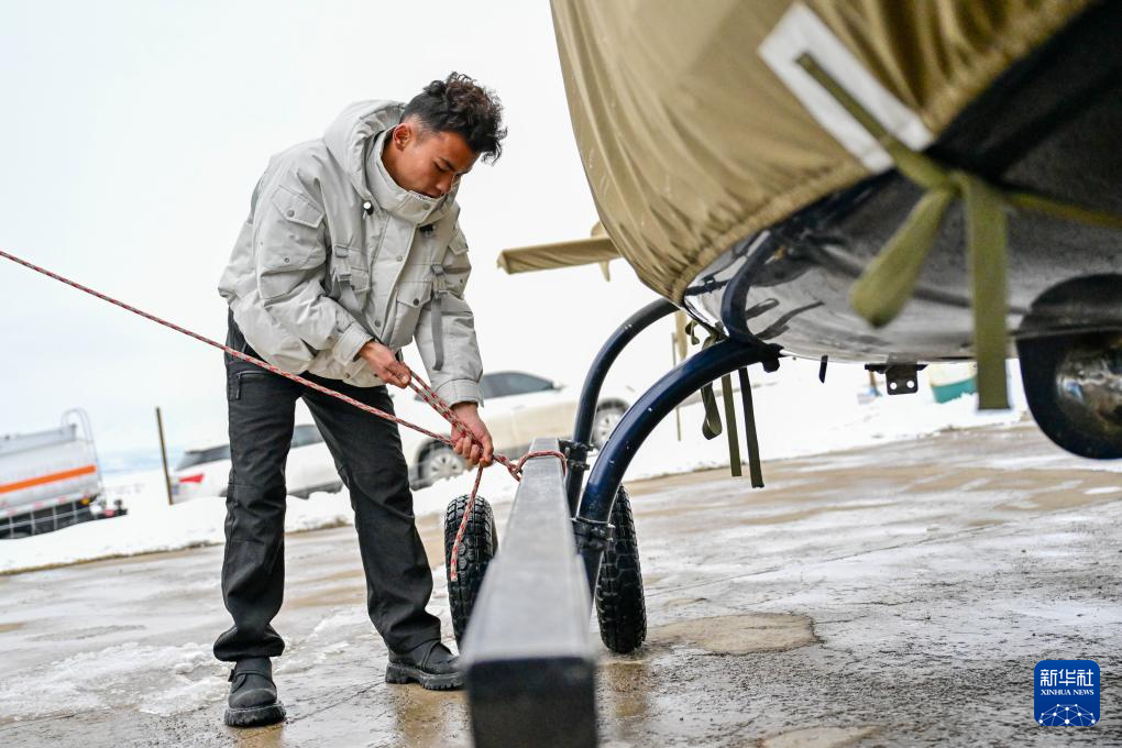 在新疆那拉提羽泊通用航空有限責任公司直升機起降點,米爾別克·特留別克為直升機做防護(3月4日攝)。