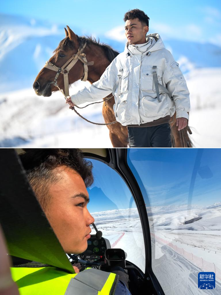 這是一張拼版照片,上圖為:在新疆伊犁哈薩克自治州新源縣,米爾別克·特留別克工作之余牽著馬漫步在那拉提景區(3月10日攝);下圖為:在新疆伊犁哈薩克自治州新源縣那拉提景區上空,米爾別克·特留別克駕駛直升機做針對性飛行訓練(3月5日攝)。