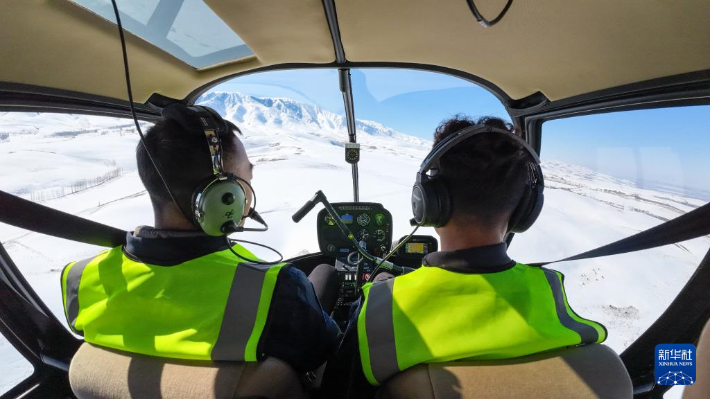 在新疆伊犁哈薩克自治州新源縣那拉提景區上空,米爾別克·特留別克(左)和師傅渠敬偉做針對性飛行訓練(3月5日攝)。