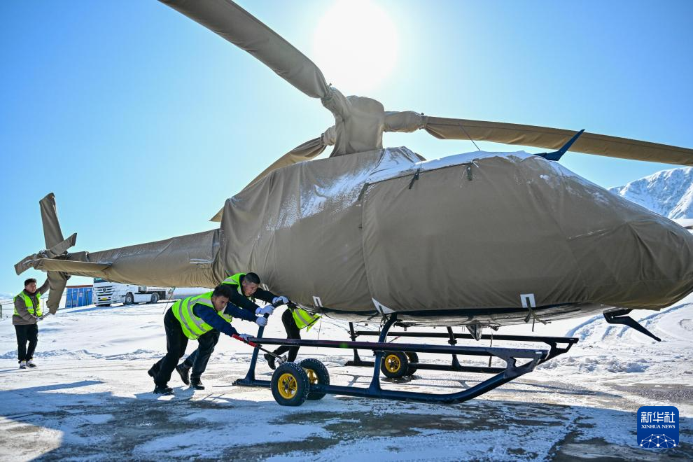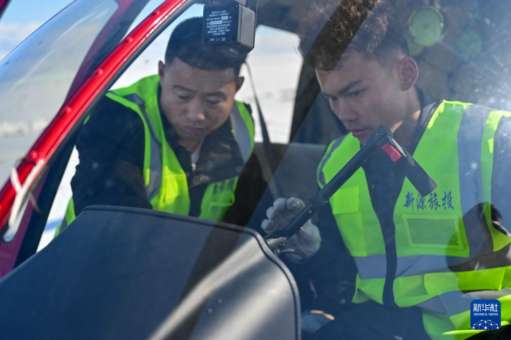 在新疆那拉提羽泊通用航空有限責任公司直升機起降點,米爾別克·特留別克(右)和機務人員在飛行前檢查機上設備(3月5日攝)。