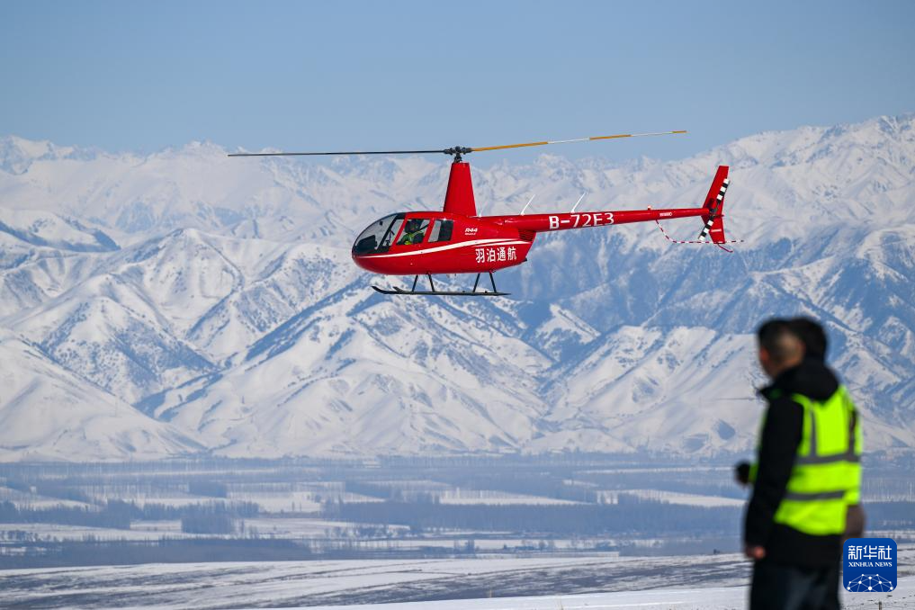 在新疆那拉提羽泊通用航空有限責任公司直升機起降點,米爾別克·特留別克完成針對性飛行訓練(3月5日攝)。