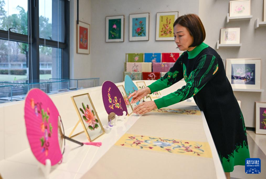 3月14日,在武漢市任煒漢繡工作室,任煒在觀看展出的刺繡作品。