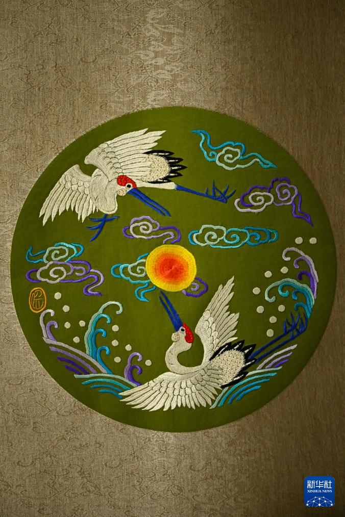 這是3月14日在任煒漢繡工作室拍攝的漢繡作品“雙鶴朝陽”。