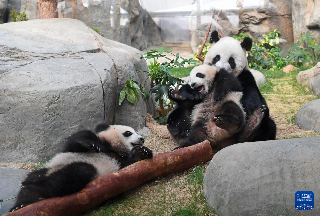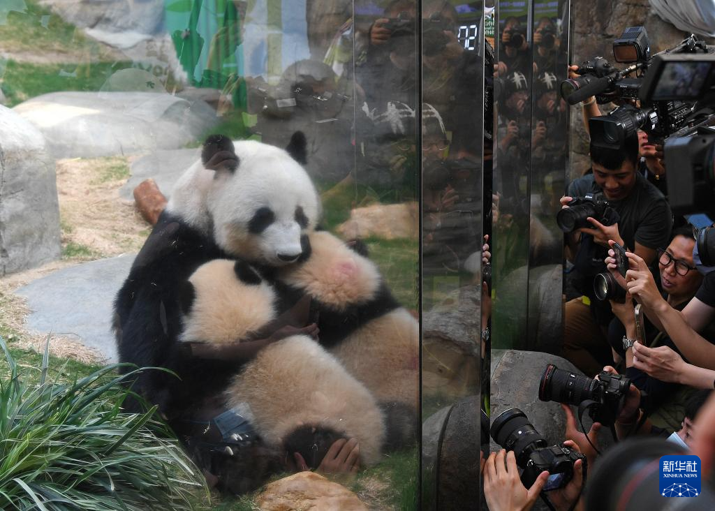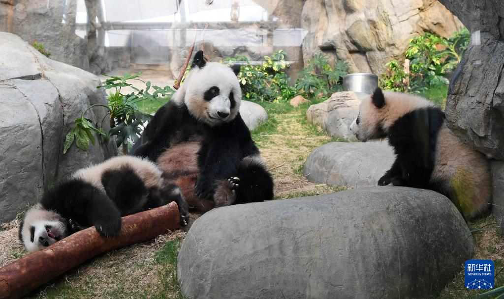 3月21日,在香港海洋公園,大熊貓“盈盈”和龍鳳胎寶寶在一起。