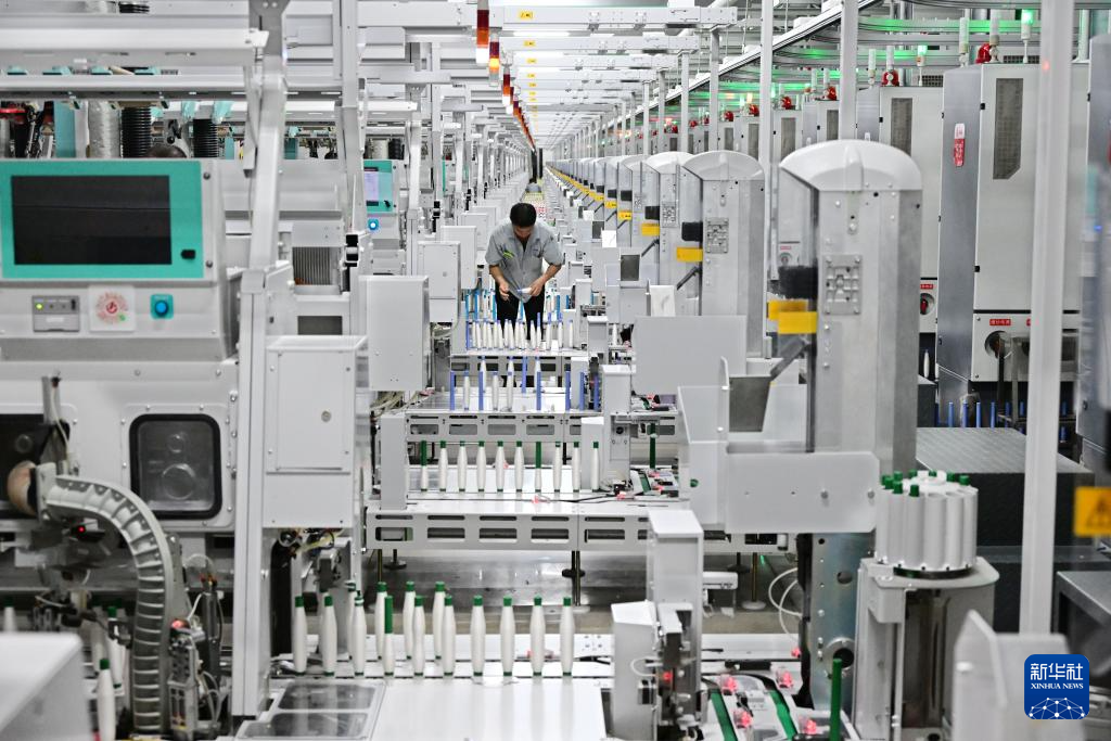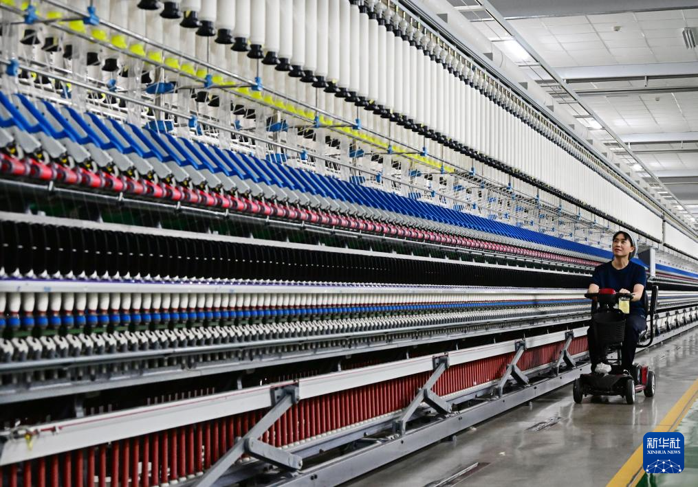 即墨區一家智慧紡紗企業的職工駕駛代步車巡檢自動化超長細紗生產線(3月25日攝)。