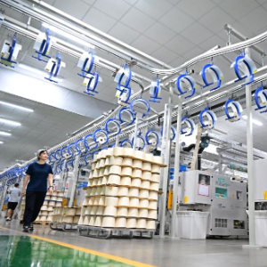在即墨區一家智慧紡紗企業,新安裝的自動化吊運傳送設備在試運行(3月25日攝)。