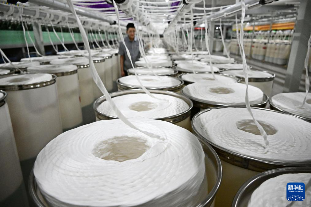 即墨區一家智慧紡紗企業的職工在全自動絡筒生產線上抽檢高端纖維品質(3月25日攝)。