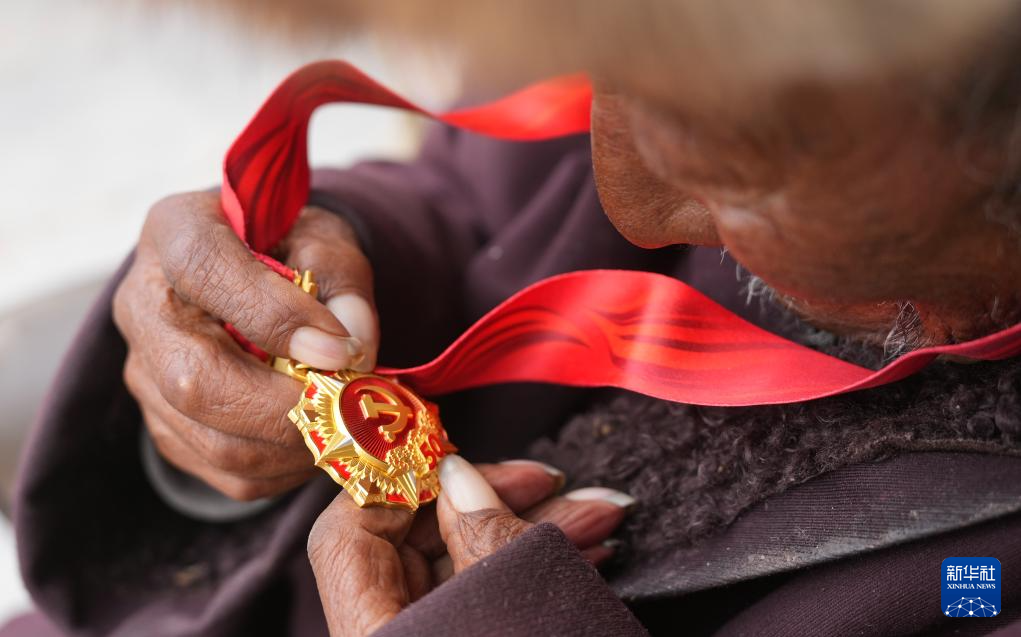 索扎老人端詳“光榮在黨50年”紀念章(3月20日攝)。