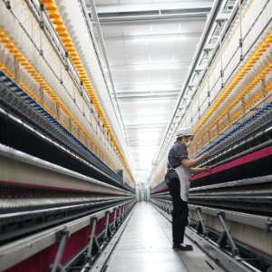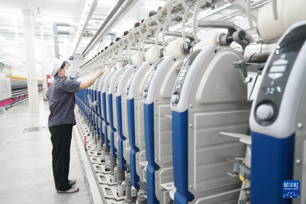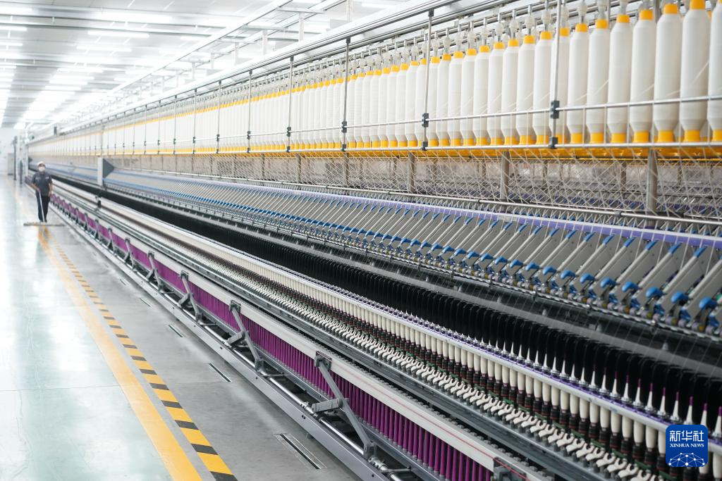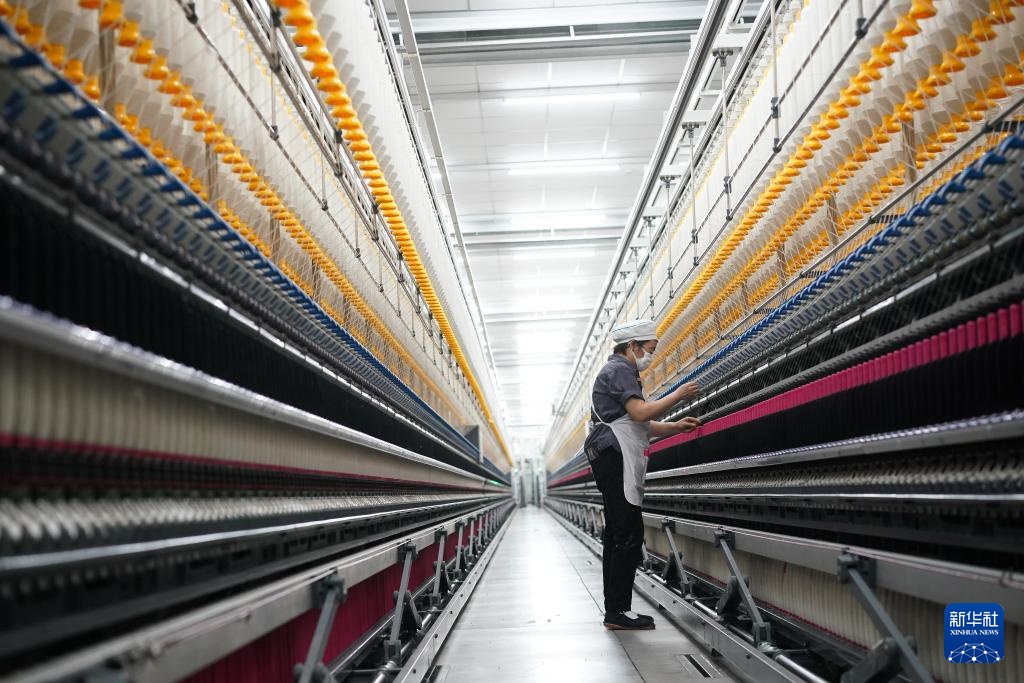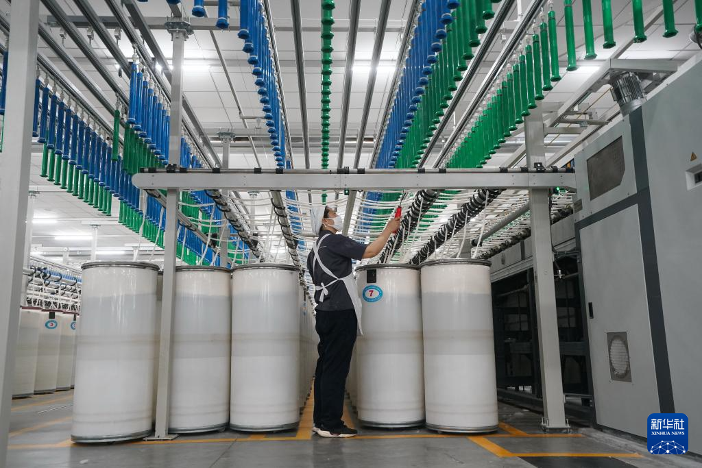 4月5日,工人在江蘇泰達紡織科技有限公司智慧化紡紗工廠作業。