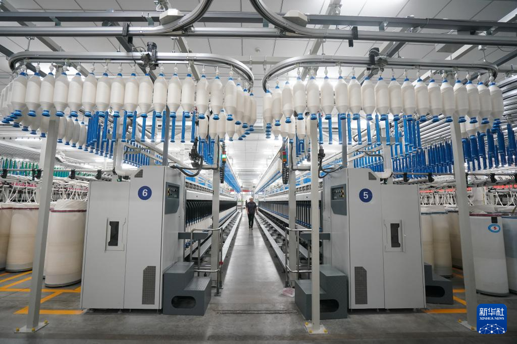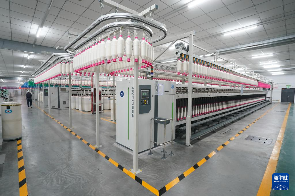 4月5日拍攝的江蘇泰達紡織科技有限公司智慧化紡紗工廠生產場景。