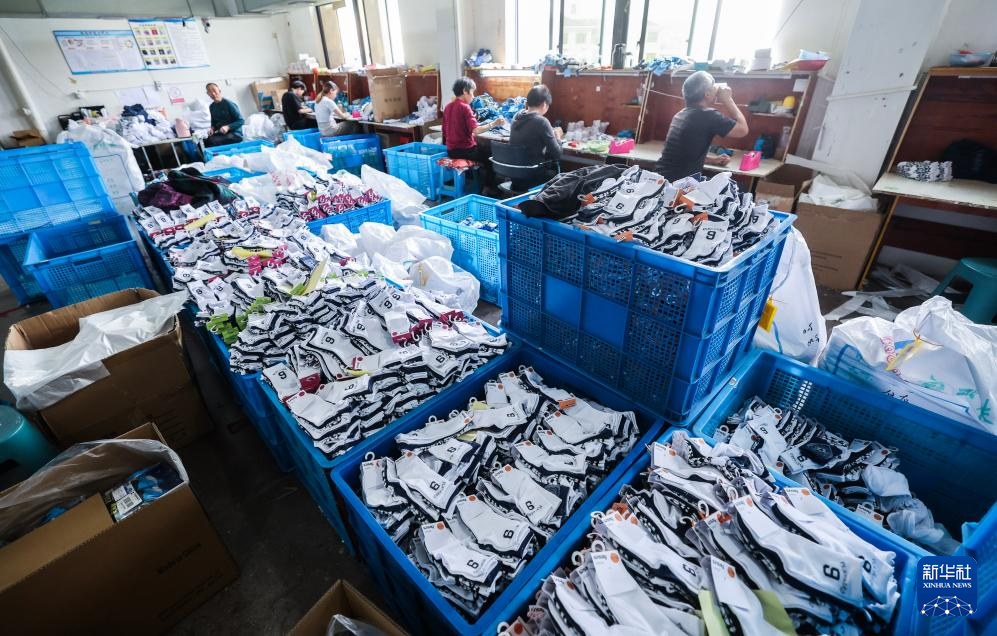 4月10日,在諸暨市緣錦針織有限公司的流水線上,工人在打包出口國外市場的襪子。