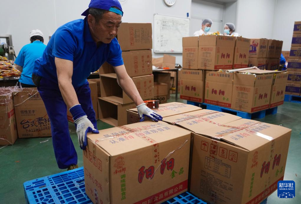 4月8日,在沈陽市陽陽食品有限公司,工人將辣條打包裝箱。