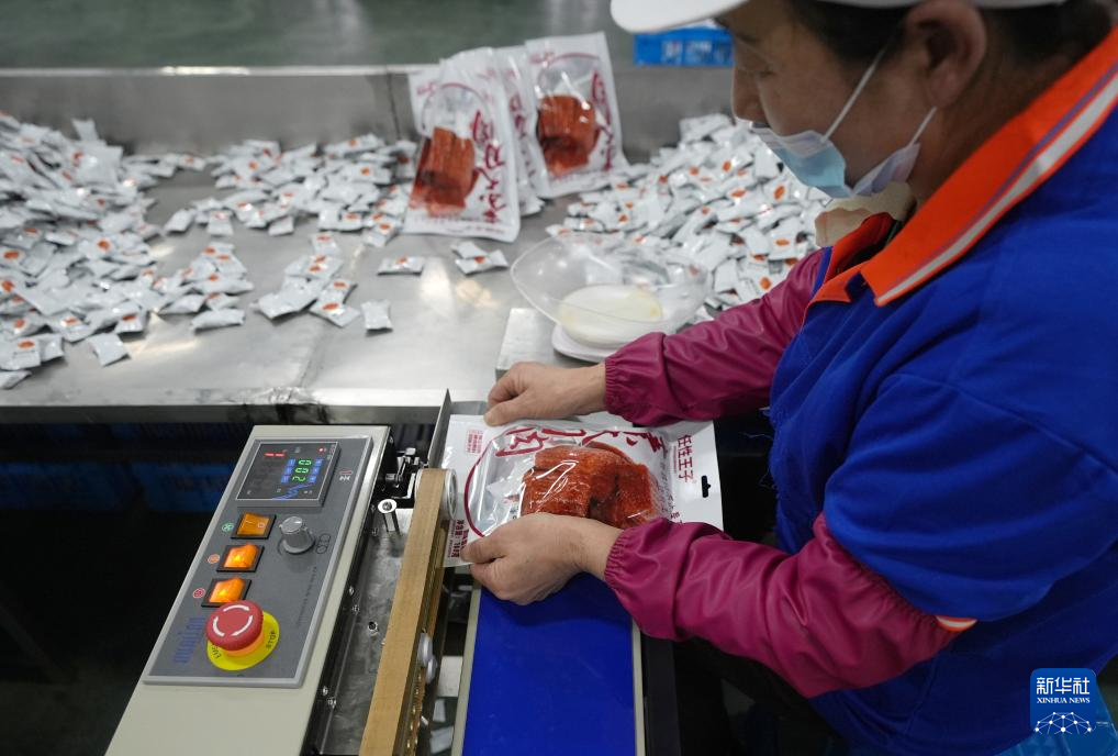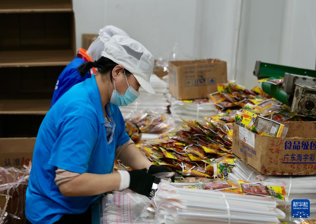 4月8日,在沈陽市陽陽食品有限公司,工人將辣條裝袋。