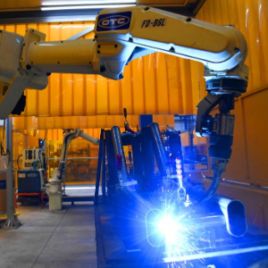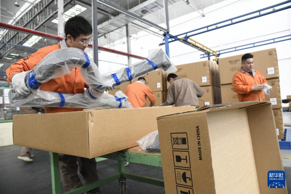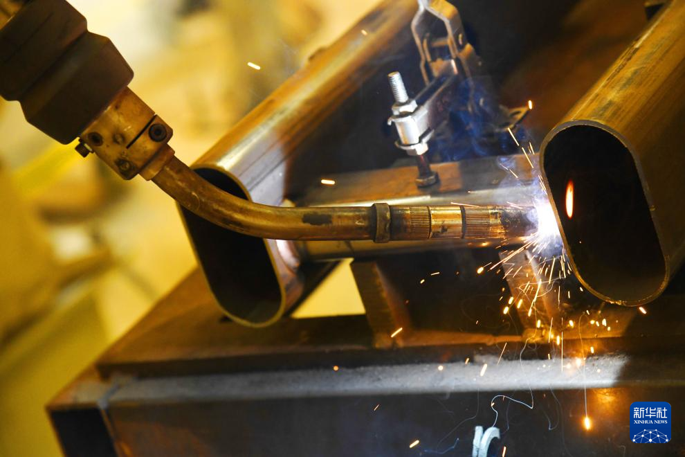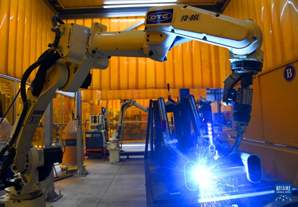 青島英派斯健康科技股份有限公司智慧工廠內的自動激光焊接機器人在作業(4月22日攝)。