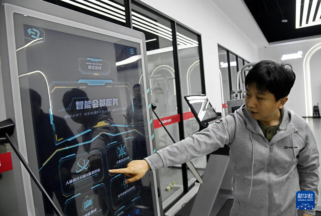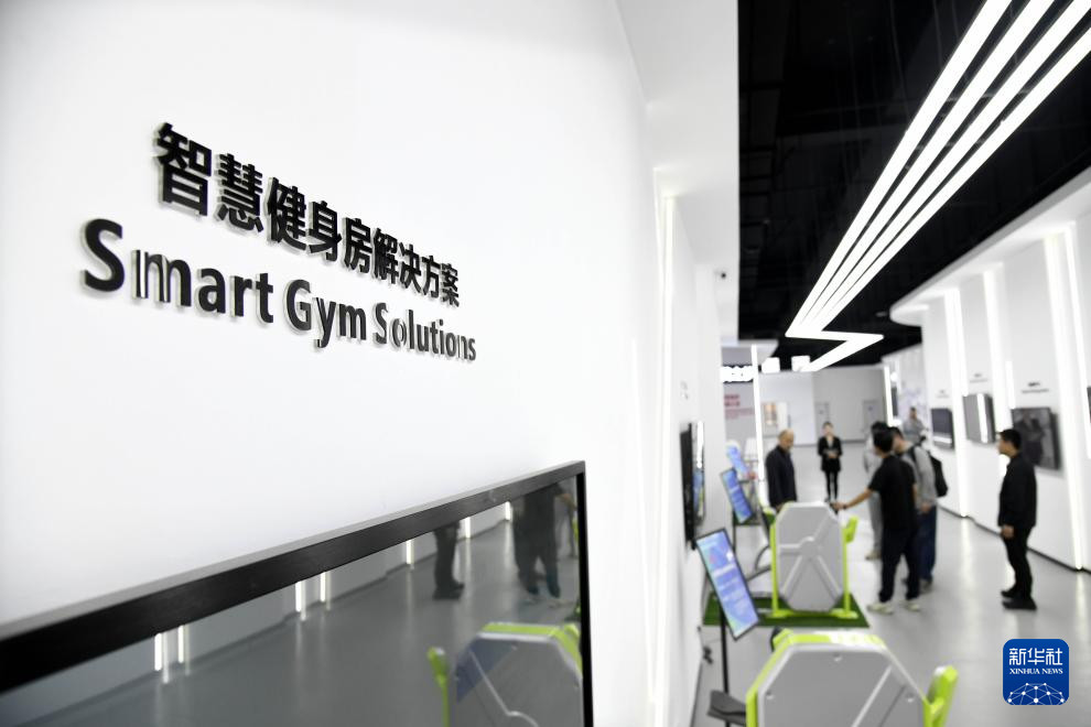4月22日,參觀者在青島英派斯健康科技股份有限公司展廳內了解智慧健身房解決方案。