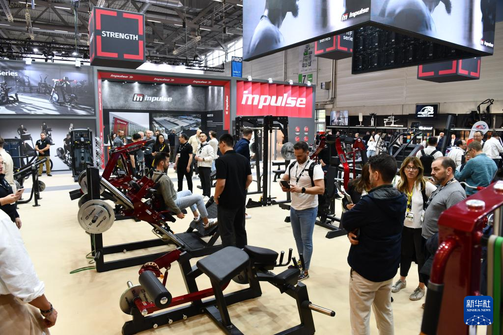 參觀者在2025年德國科隆健身健美及康體設施博覽會英派斯展位上體驗(4月10日攝)。