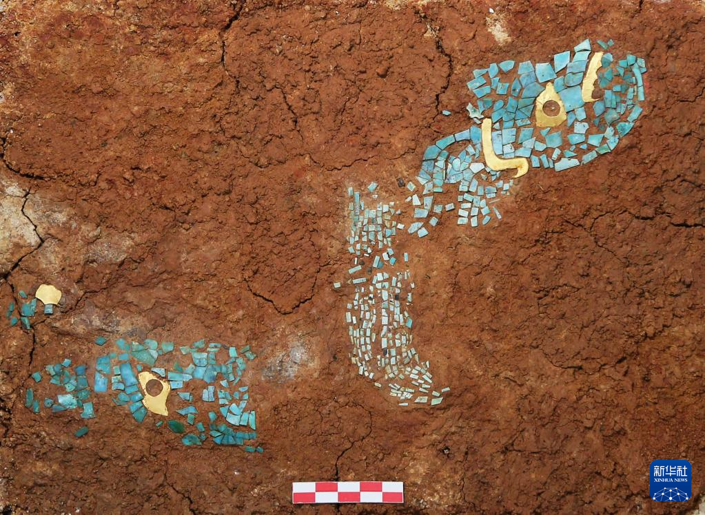 湖北黃陂盤龍城遺址楊家灣M17出土的金片綠松石鑲嵌飾(資料照片)。