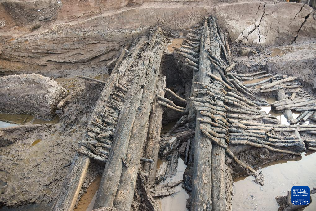 云南晉寧河泊所遺址出土的大型木構遺跡(資料照片)。