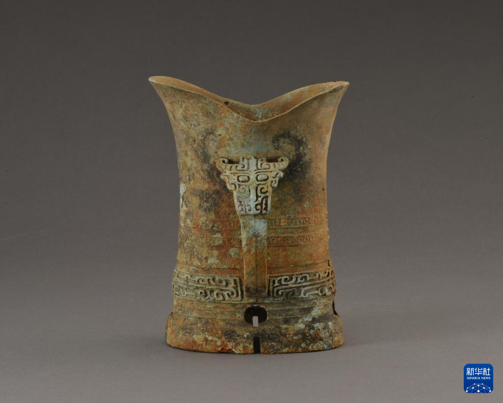 湖北黃陂盤龍城遺址楊家灣M17出土的銅帶鋬觚形器(資料照片)。