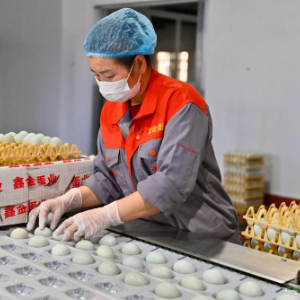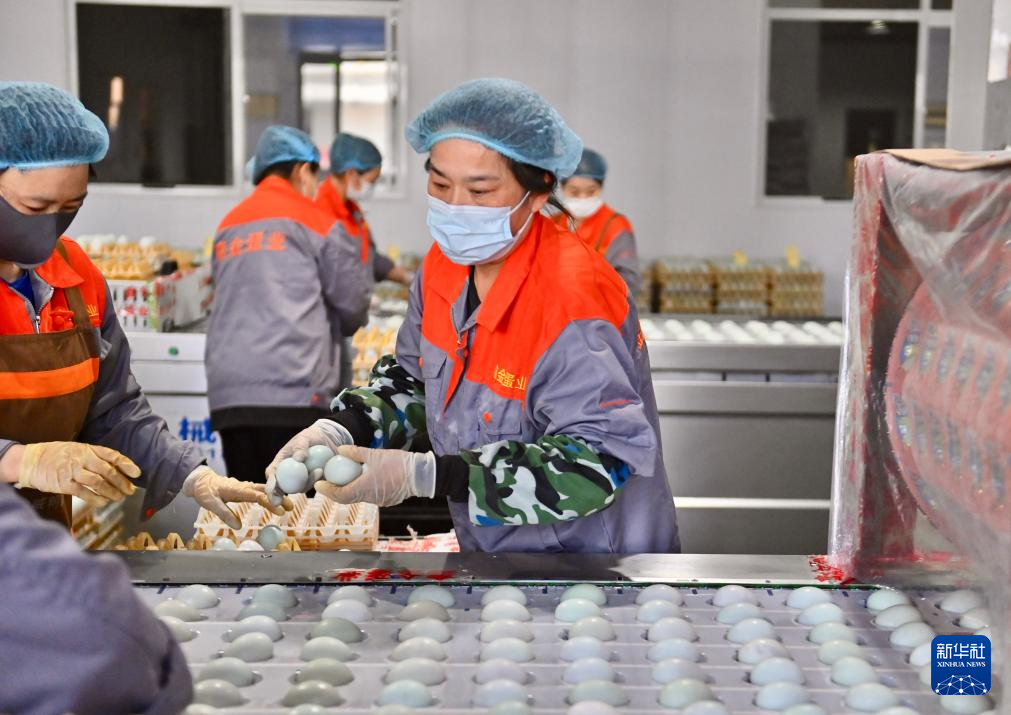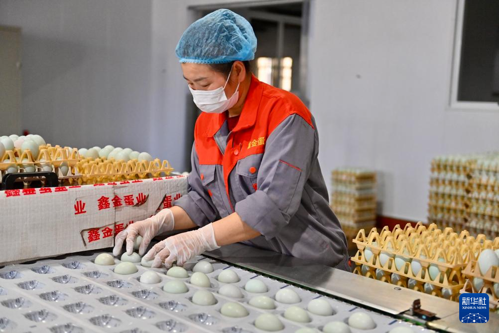 4月24日,在位于遼陽市的遼寧鑫金科技實業集團有限公司的加工廠內,工人將鴨蛋碼放到生產線上。