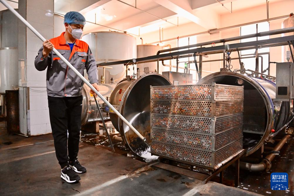 4月24日,在位于遼陽市的遼寧鑫金科技實業集團有限公司的加工廠內,工人在查看煮熟的鴨蛋。